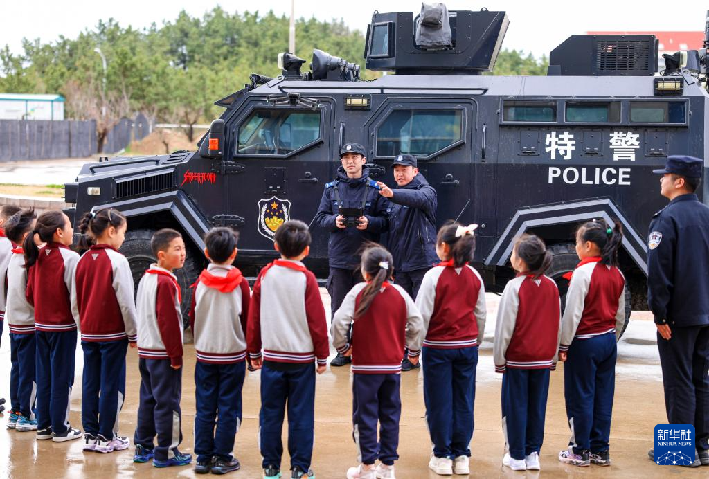 4月14日,在山东省荣成市府新小学操场,特巡警队员向学生展示警用无人机的用途及使用方法。