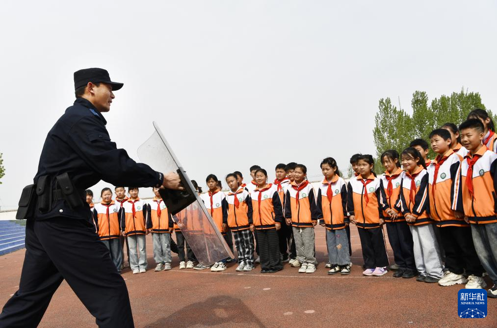 4月14日,在山东省枣庄市山亭区桑村镇中心小学,民警向小学生演示防爆盾牌的使用方法。