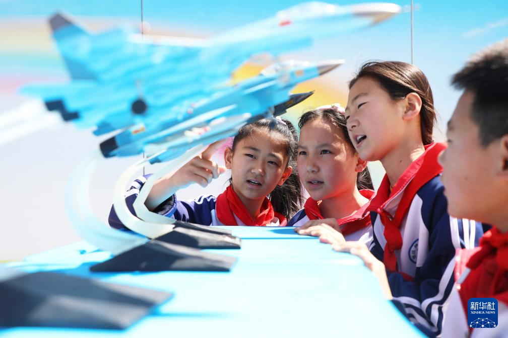 4月14日,在河北省唐山市丰润区常庄镇大杨庄小学,学生通过模型了解国防武器知识。