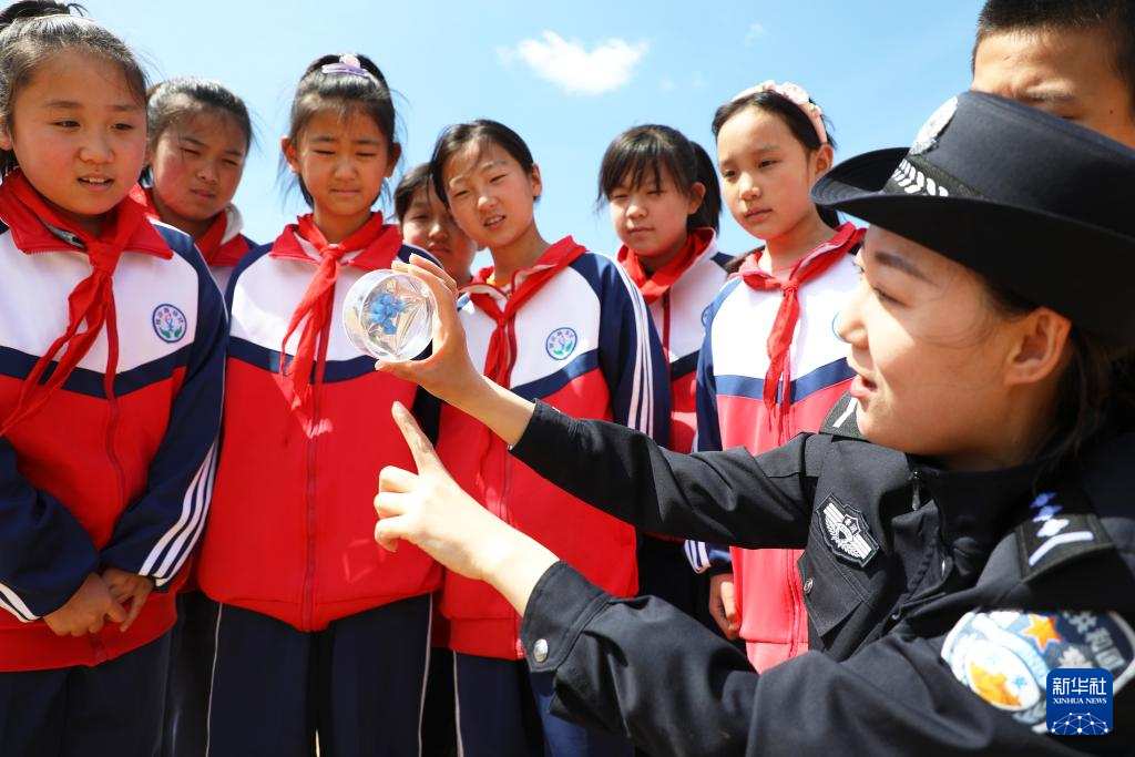 4月14日,在河北省唐山市丰润区常庄镇大杨庄小学,辅警为学生讲解禁毒知识。