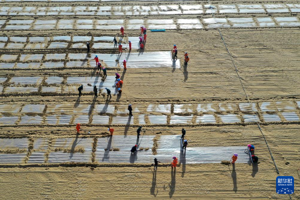 在新疆和田地区于田县沙产业实验基地,当地群众在种植薏米(4月8日摄,无人机照片)。