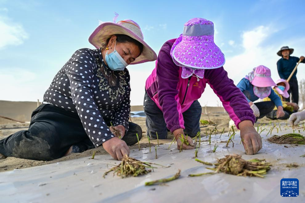 在新疆和田地区民丰县防沙治沙试验站,工作人员在沙地种植洋葱(4月8日摄)。