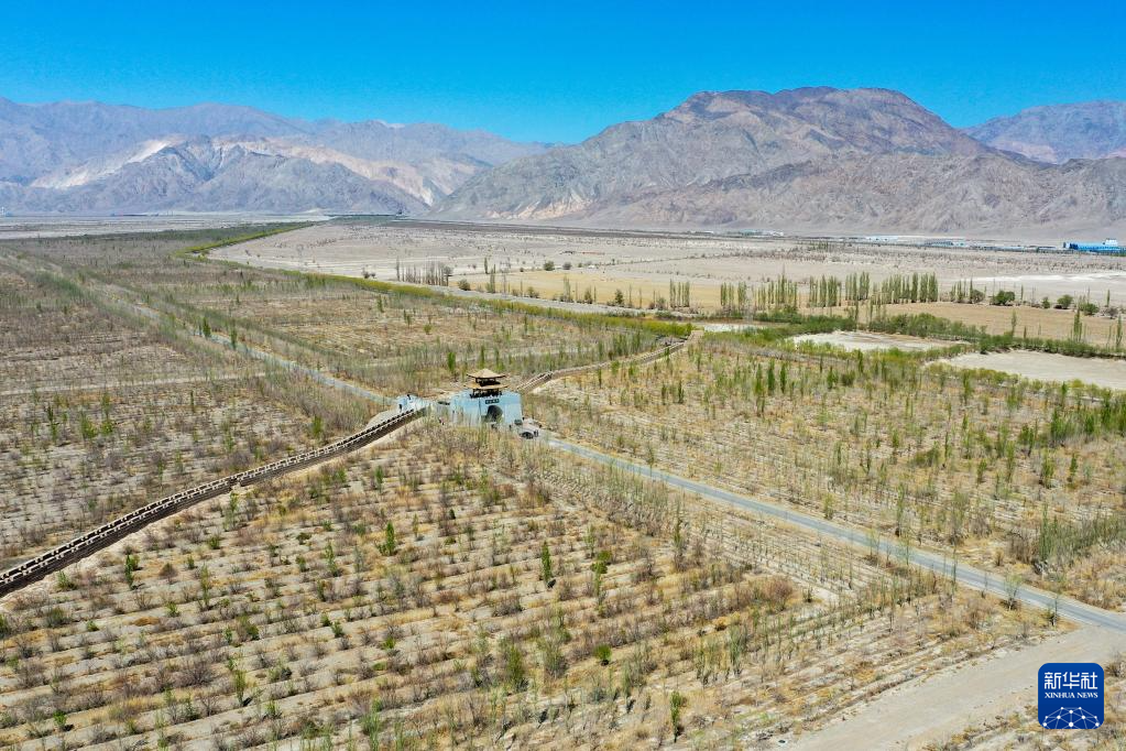 这是在新疆和田地区民丰县拍摄的后河坝“工程治沙+生物治沙”叠加治理区(4月8日摄,无人机照片)。