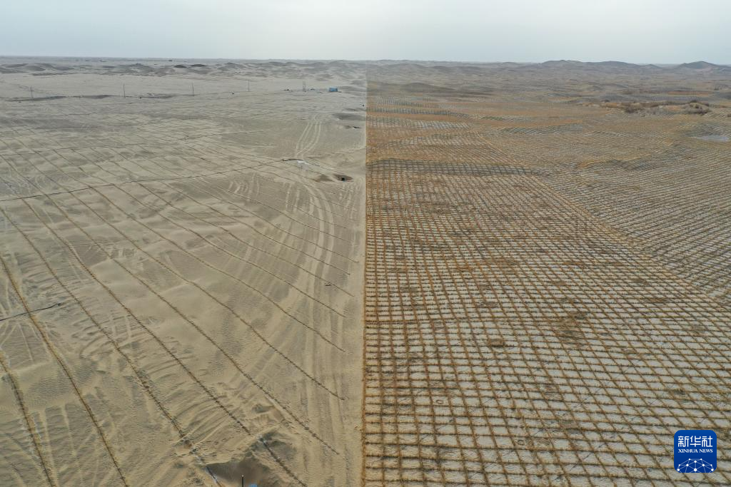 这是在新疆和田地区民丰县后河坝“工程治沙+生物治沙”叠加治理区拍摄的芦苇方格沙障(4月8日摄,无人机照片)。