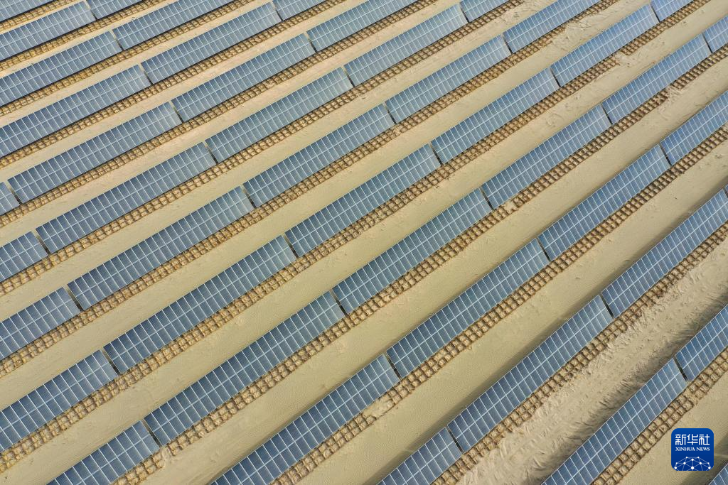 这是在新疆阿克苏地区沙雅县拍摄的25万千瓦光伏产业园区低碳转型新能源项目(4月13日摄,无人机照片)。近年来,沙雅县采取光伏治沙、生物治沙等措施,为当地构建起一道绿色屏障。
