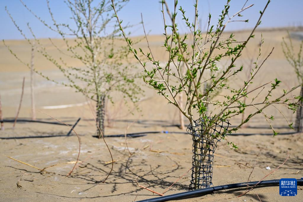 在新疆巴音郭楞蒙古自治州且末县防风治沙基地,树苗被安装防护网,防止动物啃食(4月9日摄)。