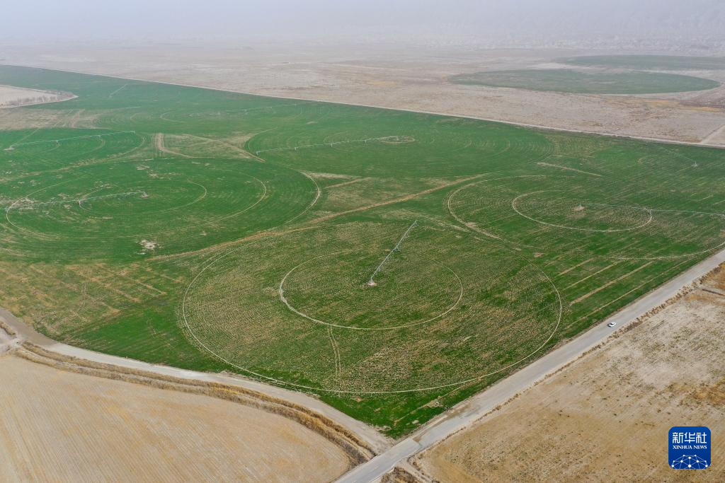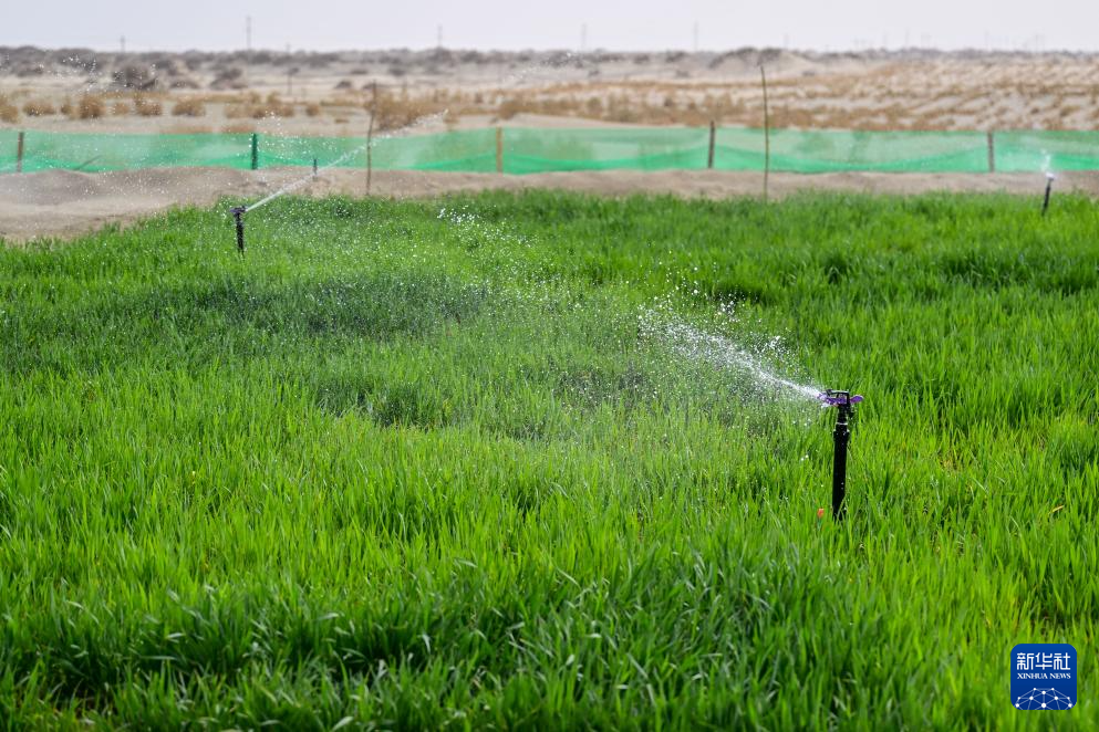 新疆阿克苏地区沙雅县沙生经济作物发展试验基地,经过苦咸水淡化技术处理的地下水喷灌出的小麦长势良好(4月13日摄)。