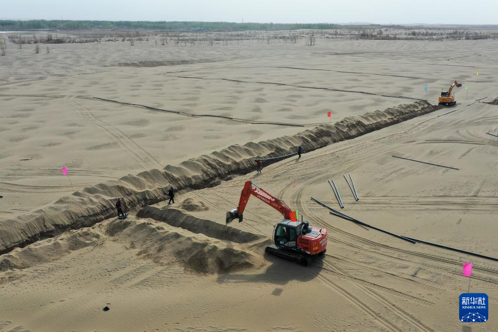在新疆和田地区民丰县防沙治沙试验站,施工人员驾驶机械预埋输水管线(4月8日摄,无人机照片)。