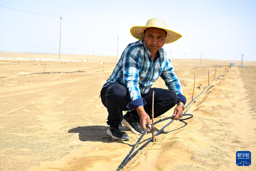 在新疆和田地区于田县阿热勒七仙女防沙治沙标杆项目区,当地村民在自己承包的沙地整理滴灌带(4月8日摄)。