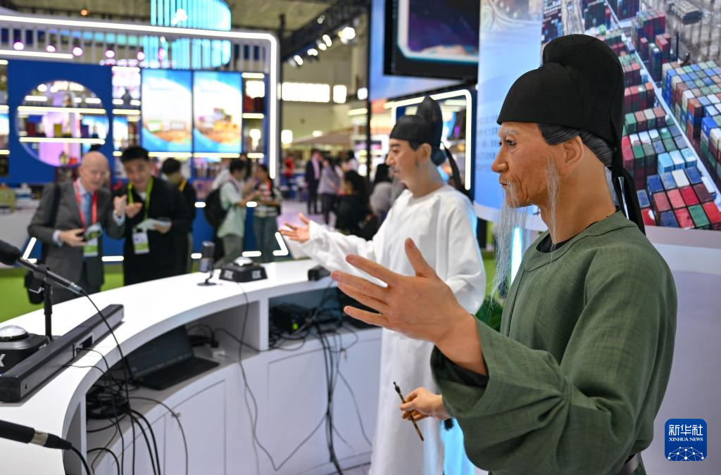 4月13日在消博会上拍摄的身着古装的仿生人形机器人。