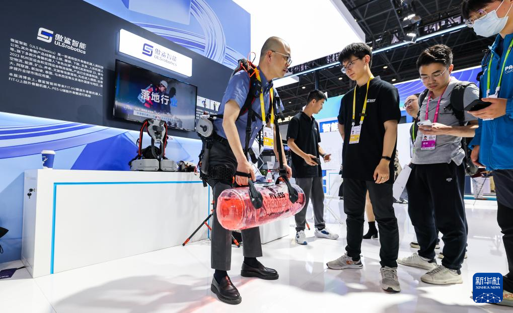 4月14日在第五届消博会上拍摄的傲鲨智能展示的外骨骼机器人。