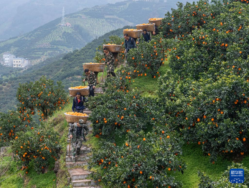 2019年2月22日,湖北省宜昌市秭归县郭家坝镇王家岭村果农在转运脐橙下山。