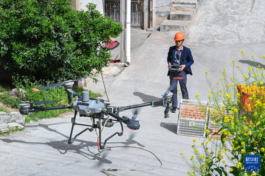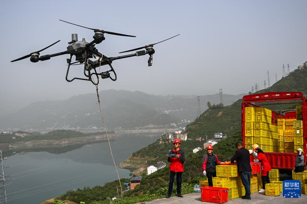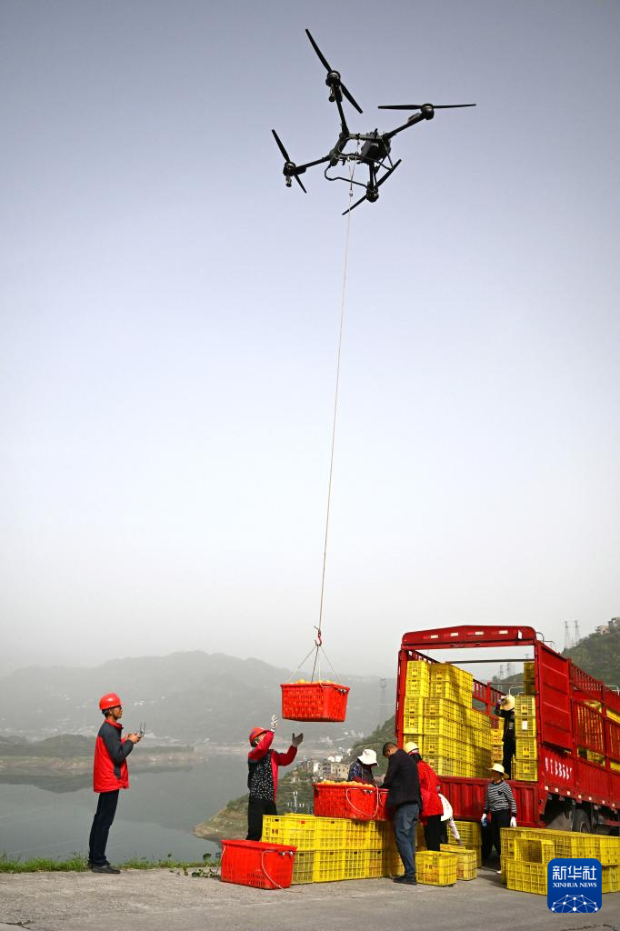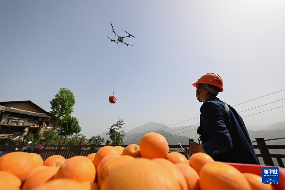 4月14日,冯立在湖北省宜昌市秭归县归州镇彭家坡村操作无人机转运脐橙。