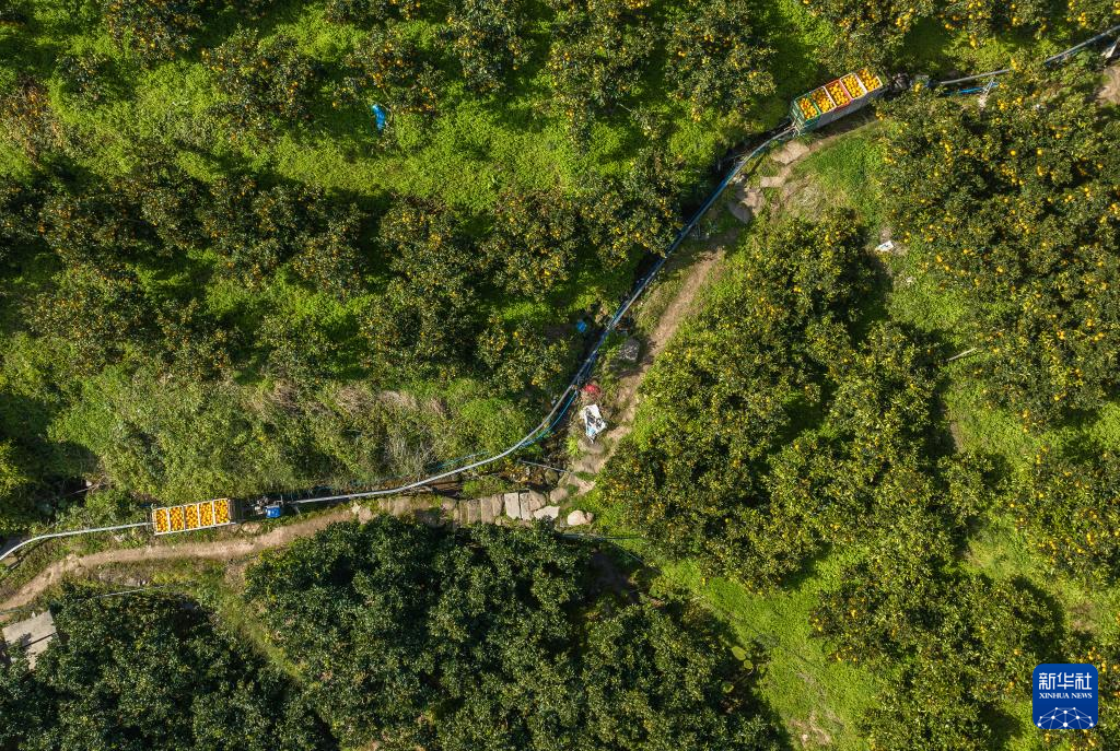 2023年12月6日,湖北省宜昌市秭归县归州镇周家湾村果农用单轨运输车转运脐橙(无人机照片)。