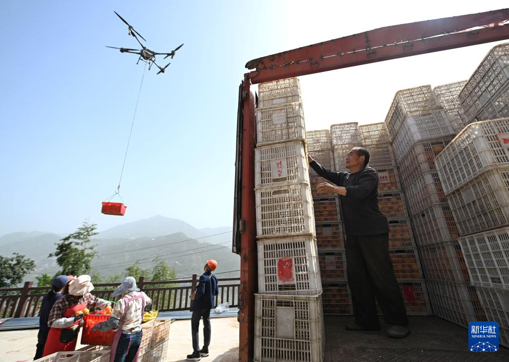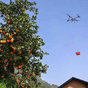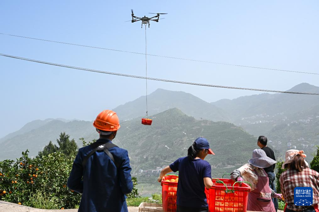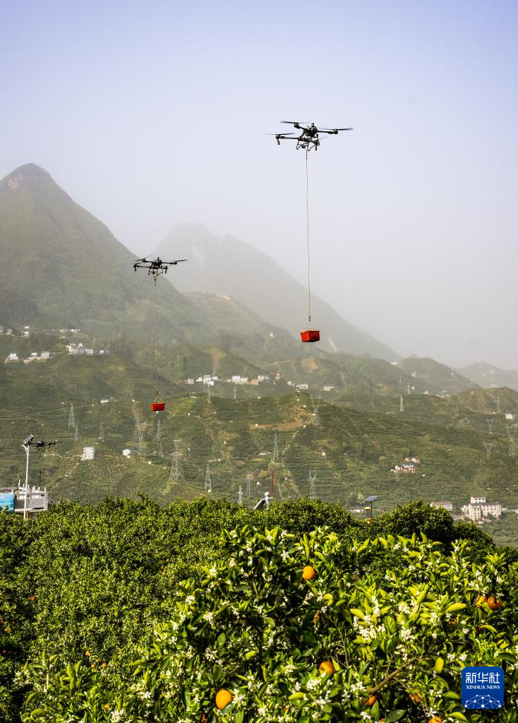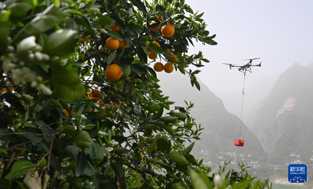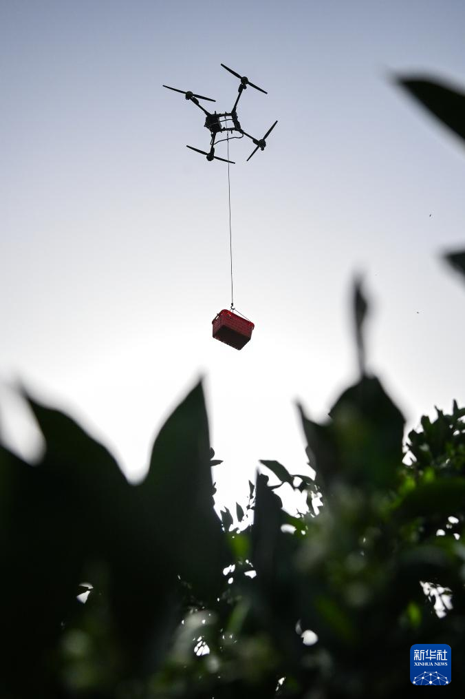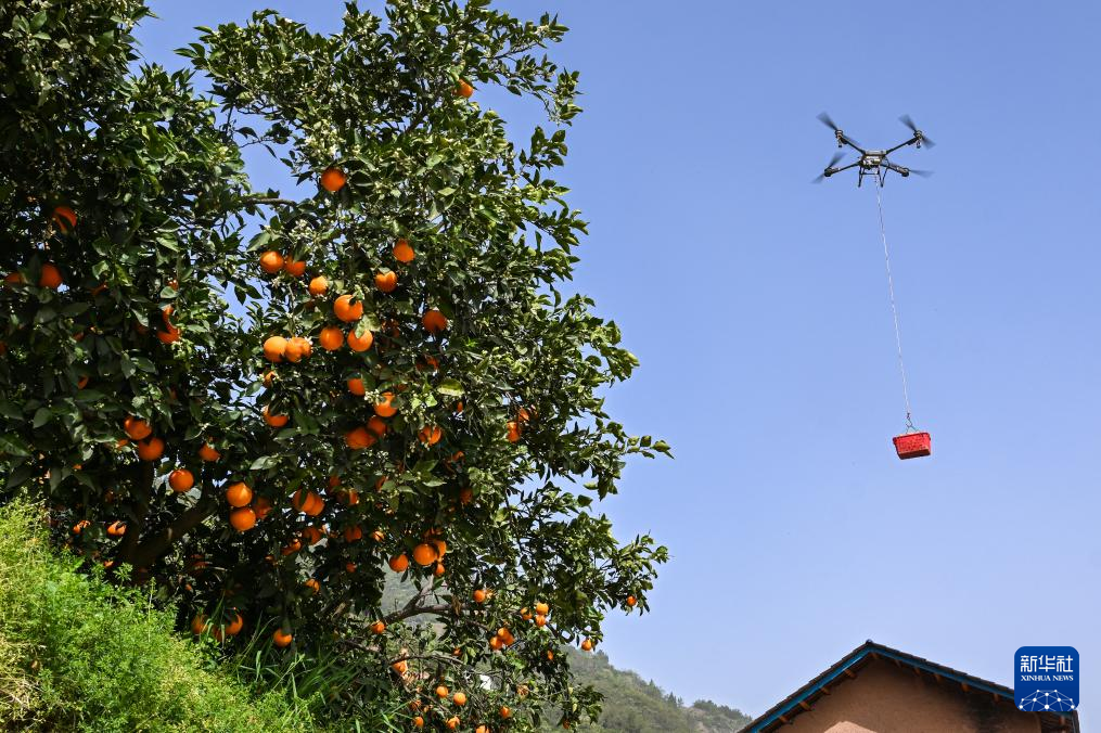 时下正值湖北省宜昌市秭归县伦晚脐橙采收旺季。在归州镇彭家坡村,种植户冯立手持遥控器,操纵载重60公斤的农用无人机从山坡的橙园腾空而起,几分钟就将鲜果投送至山腰的物流集散点。在鄂西层峦叠嶂的三峡库区,一筐筐脐橙像这样“飞往”物流集散点,“走向”各地。