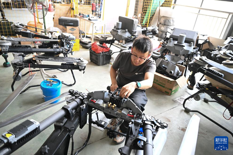4月13日,秭归鸿来农业服务有限公司的技术人员在维修无人机。