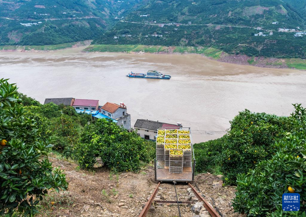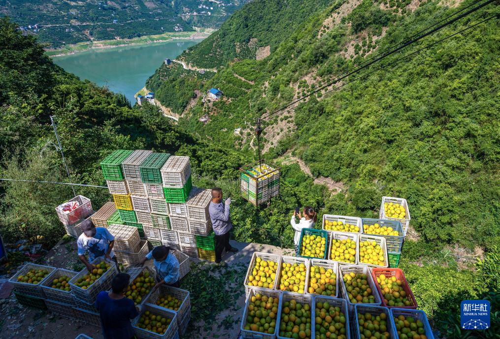 2022年8月7日,湖北省宜昌市秭归县泄滩乡坊家山村果农用索道转运夏橙下山。