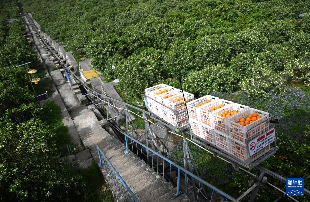 4月13日,湖北省秭归县郭家坝镇烟灯堡村村民用单轨运输车转运采摘下来的橙子。