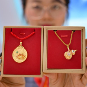 4月15日,消博会安徽馆的展商展示用花丝镶嵌、螺钿镶嵌等工艺技法制作的金饰。花丝镶嵌制作技艺是国家级非物质文化遗产。