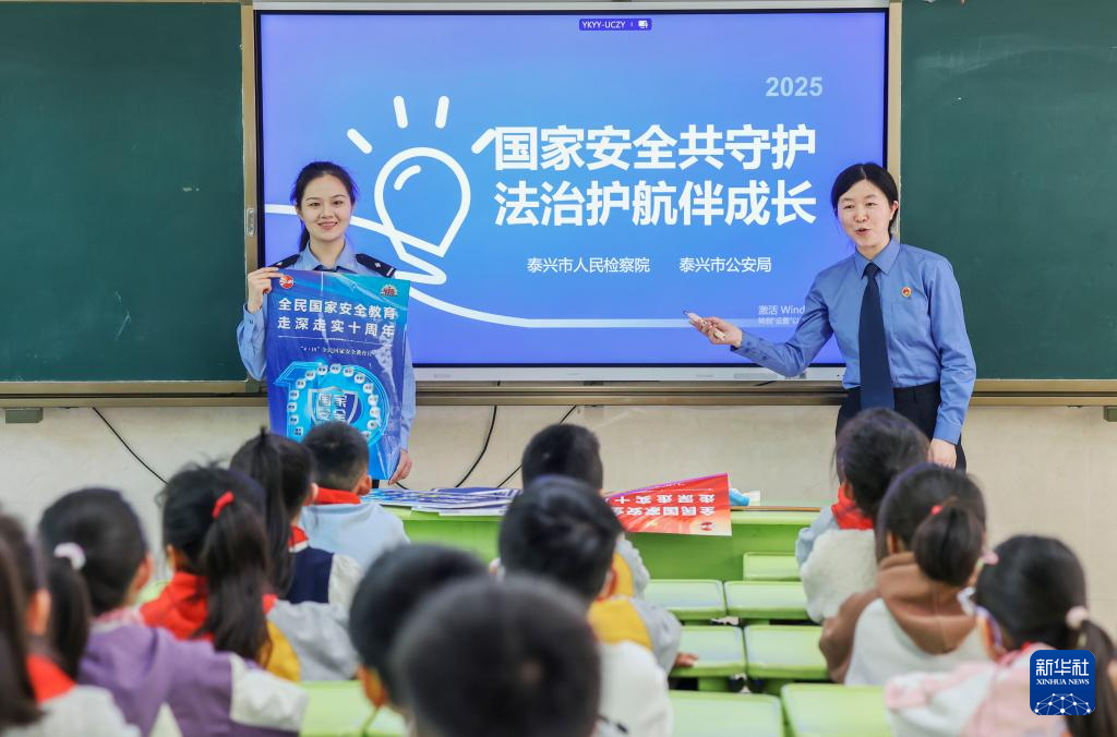 4月15日,在江苏省泰兴师范附属小学教育集团东润分校,泰兴市人民检察院法治宣讲员在给学生讲解国家安全相关法律法规知识。