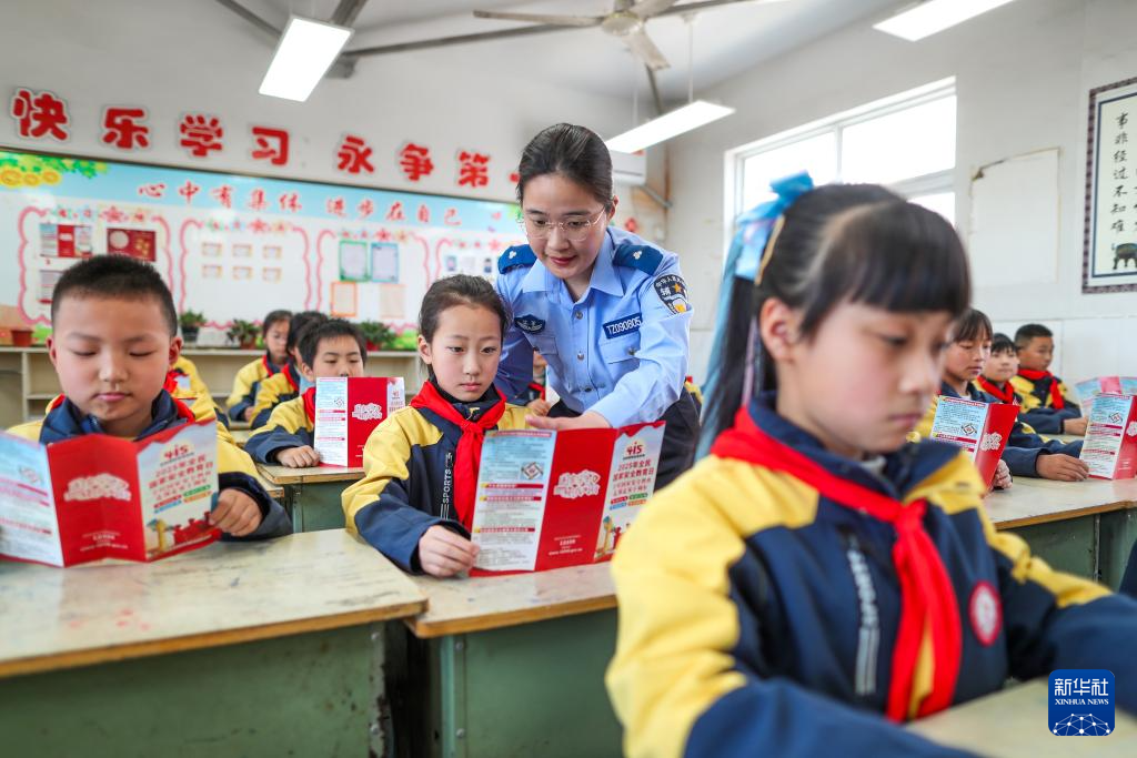 4月15日,在江苏省泰州市姜堰区蒋垛中心小学,泰州市公安局姜堰分局蒋垛派出所的辅警在给学生讲解国家安全知识。