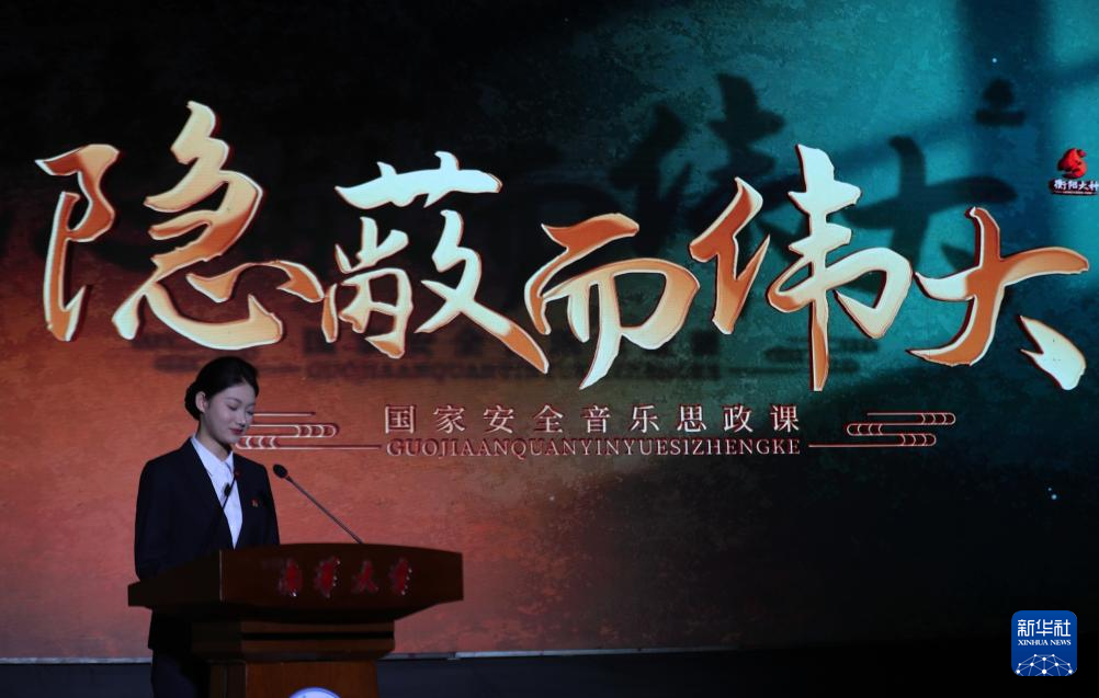 4月15日,在湖南省南华大学礼堂,串讲人在国家安全音乐思政课上讲解国家安全战线上的红色故事。