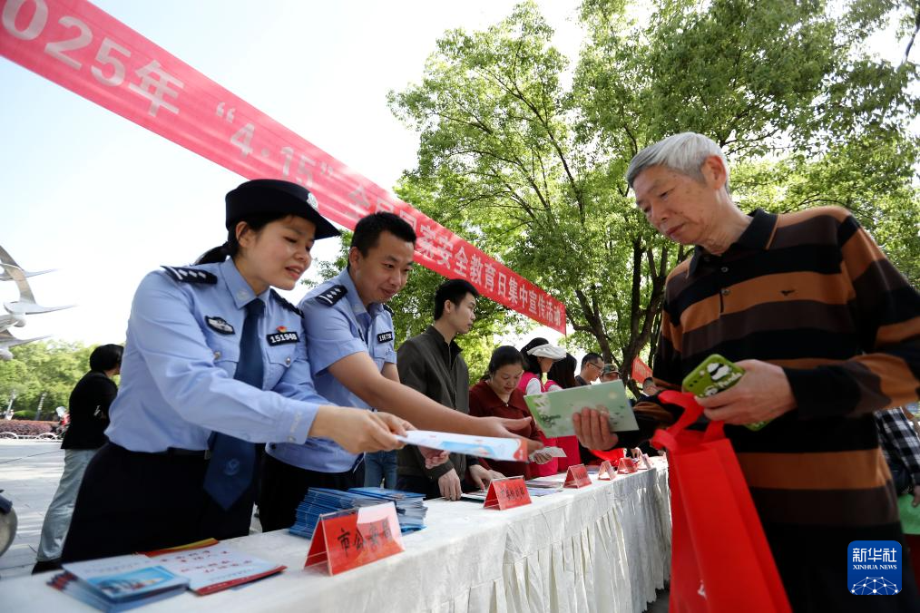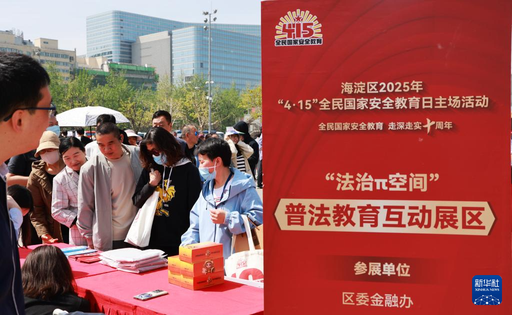 4月15日,在北京市海淀区2025年“4·15”全民国家安全教育日主场活动中,工作人员向参观者发放宣传材料。