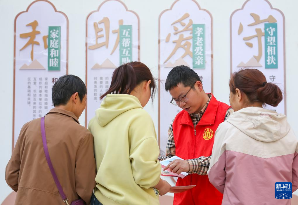 4月15日,在江苏省句容市崇明街道马扎里社区睦邻广场,志愿者为居民讲解国家安全相关知识。
