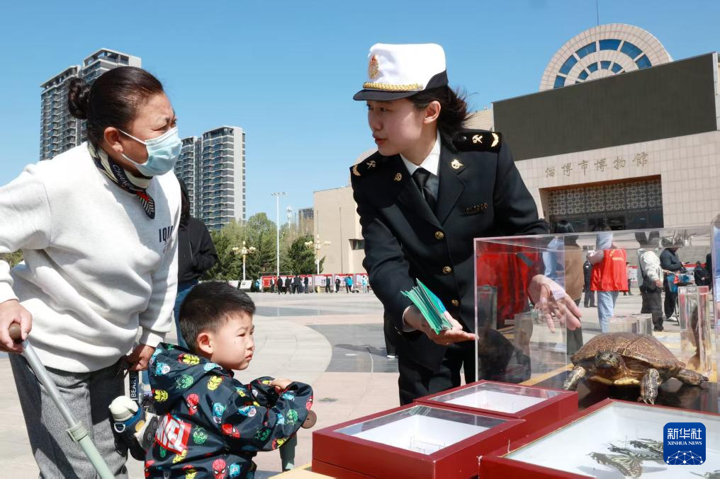 4月15日,在山东省淄博市中心广场举办的“齐心筑国安”2025年全民国家安全宣传教育主题活动上,一名海关工作人员(右)就生物安全相关知识向群众进行宣讲。