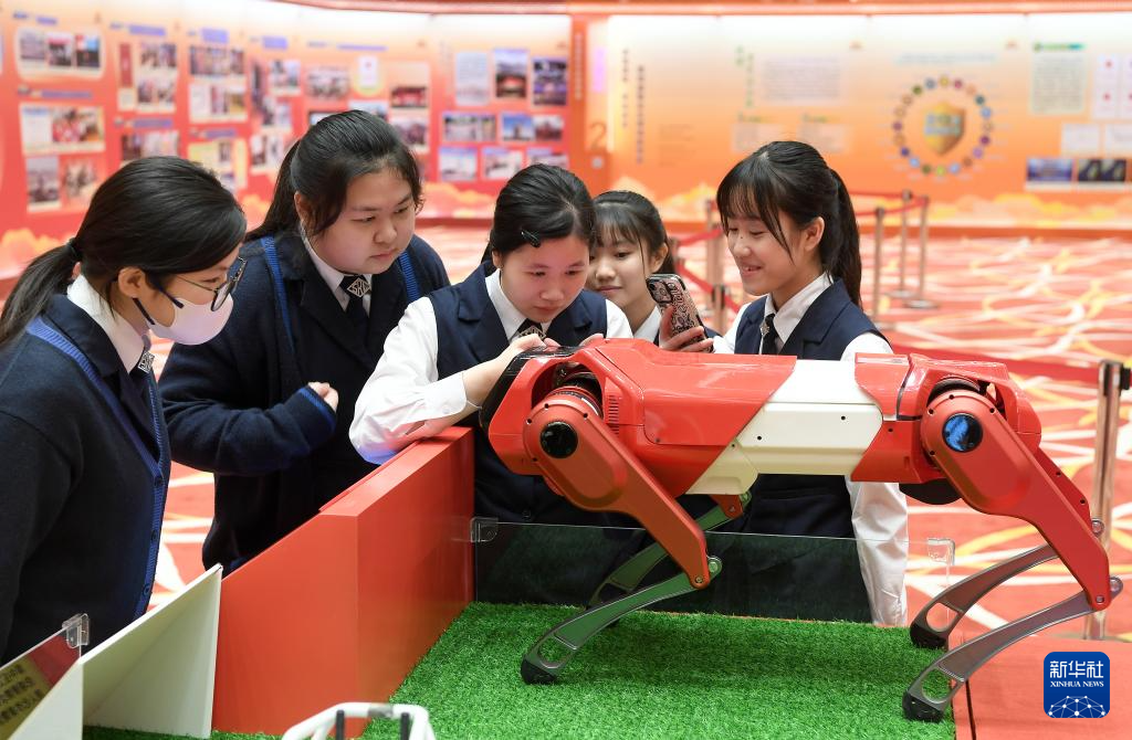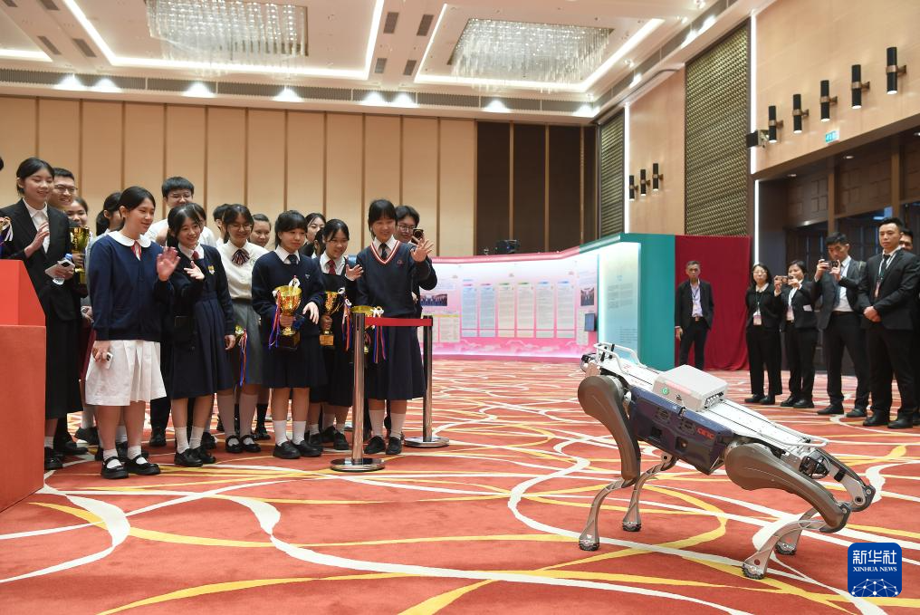 4月15日,学生在由澳门特区政府与澳门中联办合办的“全民国家安全教育展”上观看智能四足机器人。