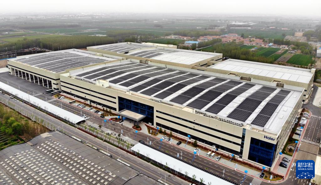 4月17日拍摄的位于青岛胶州市的海尔AI赋能多联机互联工厂(无人机照片)。