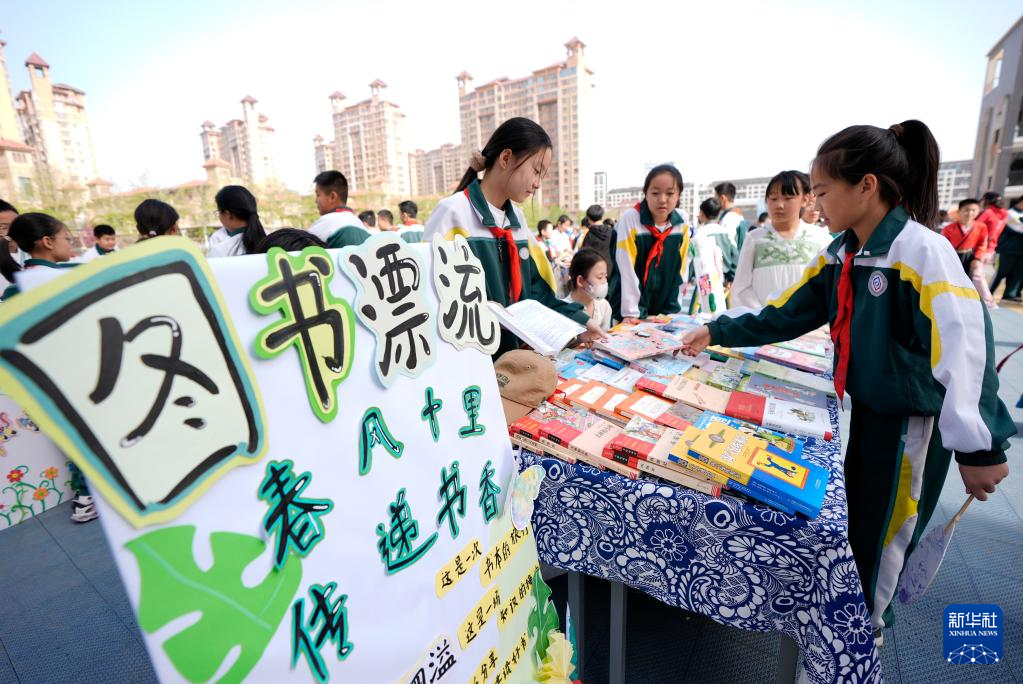 4月17日,兴庆区实验第二小学学生在活动上交换书籍。