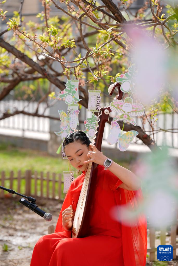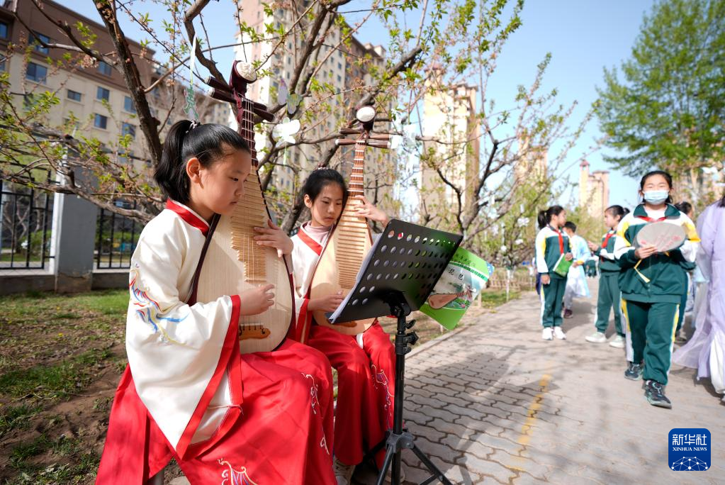 4月17日,兴庆区实验第二小学学生在活动上弹奏琵琶。
