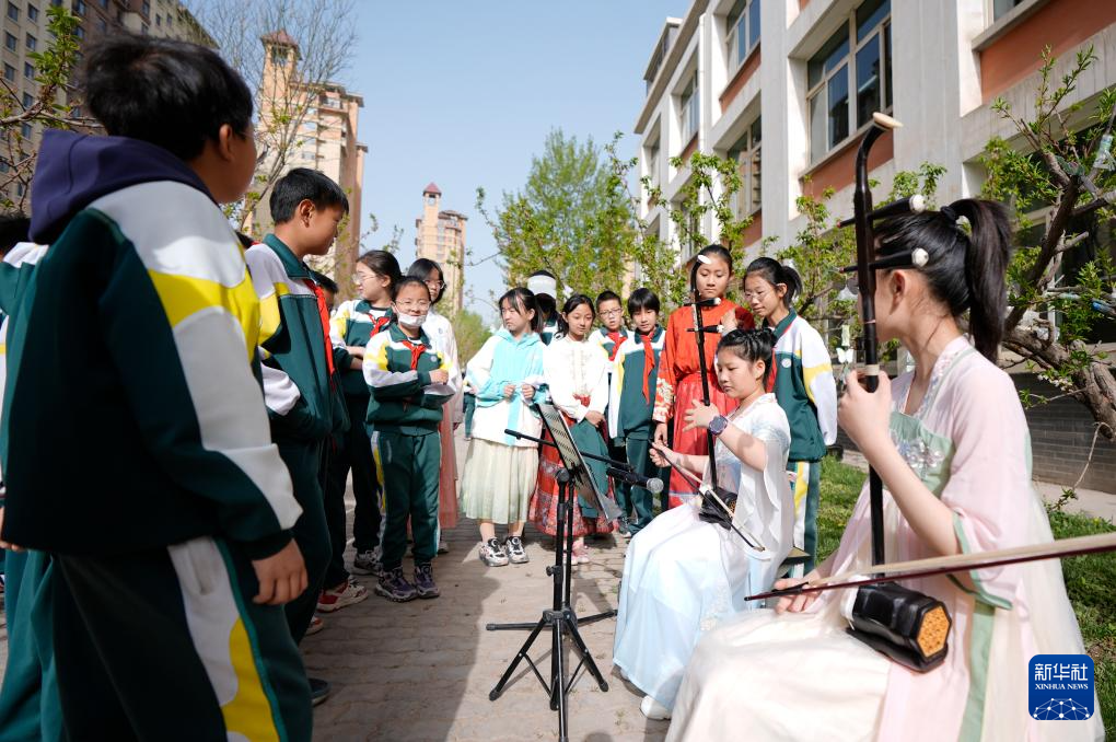 4月17日,兴庆区实验第二小学学生在活动上演奏二胡。