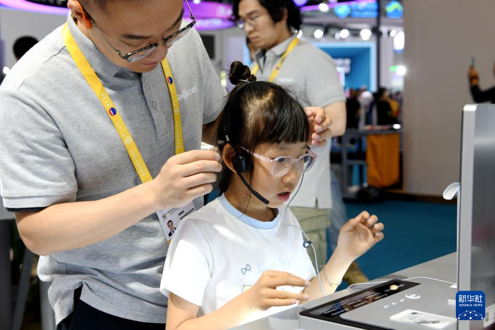 4月17日,工作人员在消博会韶音展台为小朋友佩戴试听耳机。