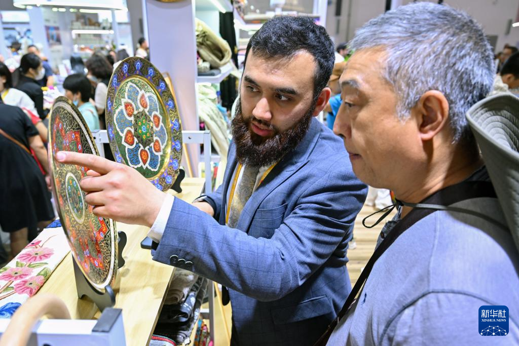 4月17日,乌兹别克斯坦展商在消博会上向观众介绍产品。