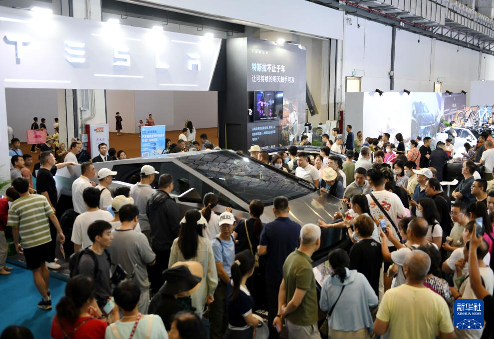 4月17日,观众在消博会特斯拉展台观看展品。