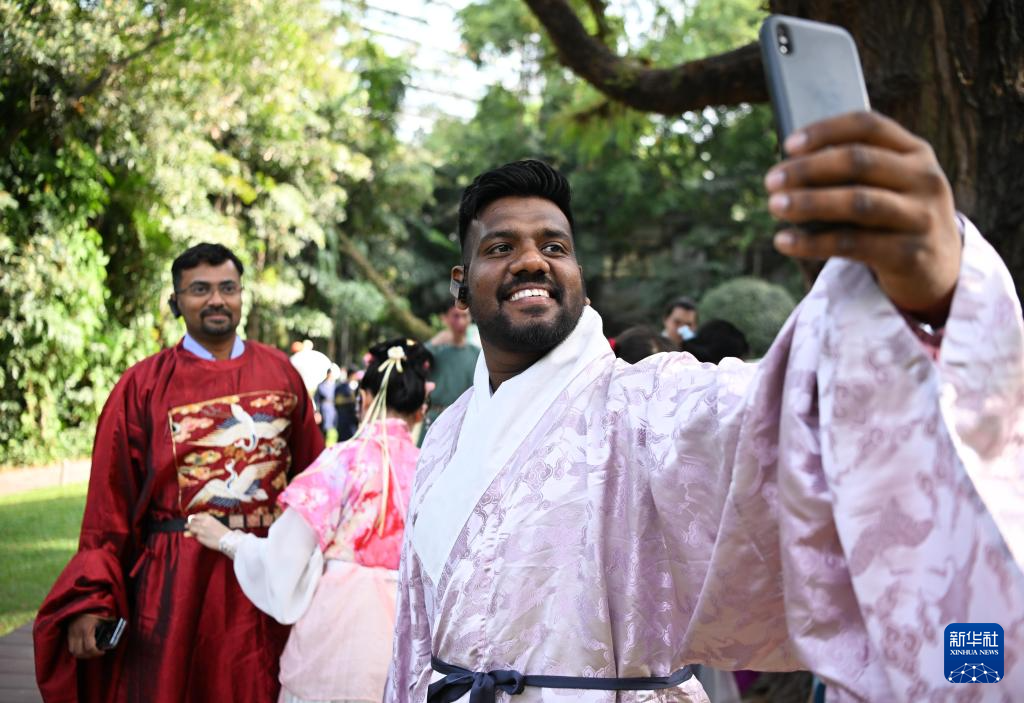 4月17日,在广州兰圃,参加第137届广交会的境外采购商身着中国传统服饰留影。