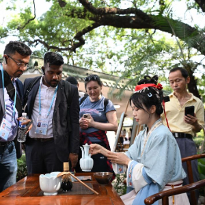 4月17日,在广州兰圃,参加第137届广交会的境外采购商观看茶艺表演。