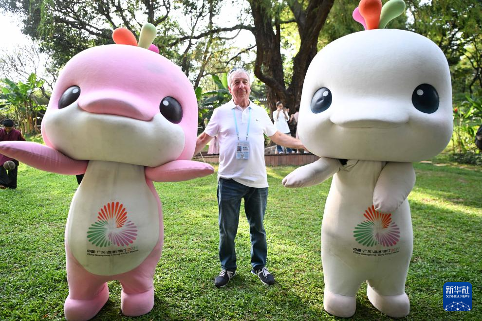 4月17日,在广州兰圃,参加第137届广交会的境外采购商与十五运会和残特奥会吉祥物合影留念。