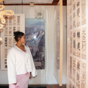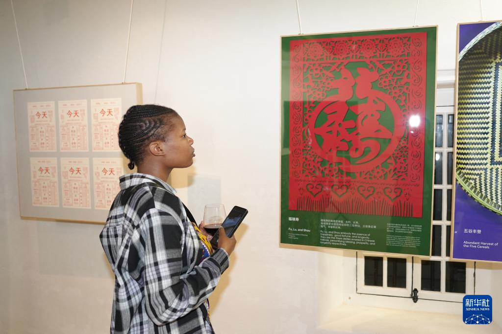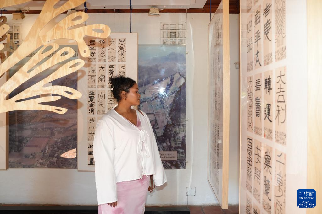 4月17日,在南非开普敦的伊齐科学习中心,一名女子在“国际中文日”庆祝活动上参观汉字艺术展。