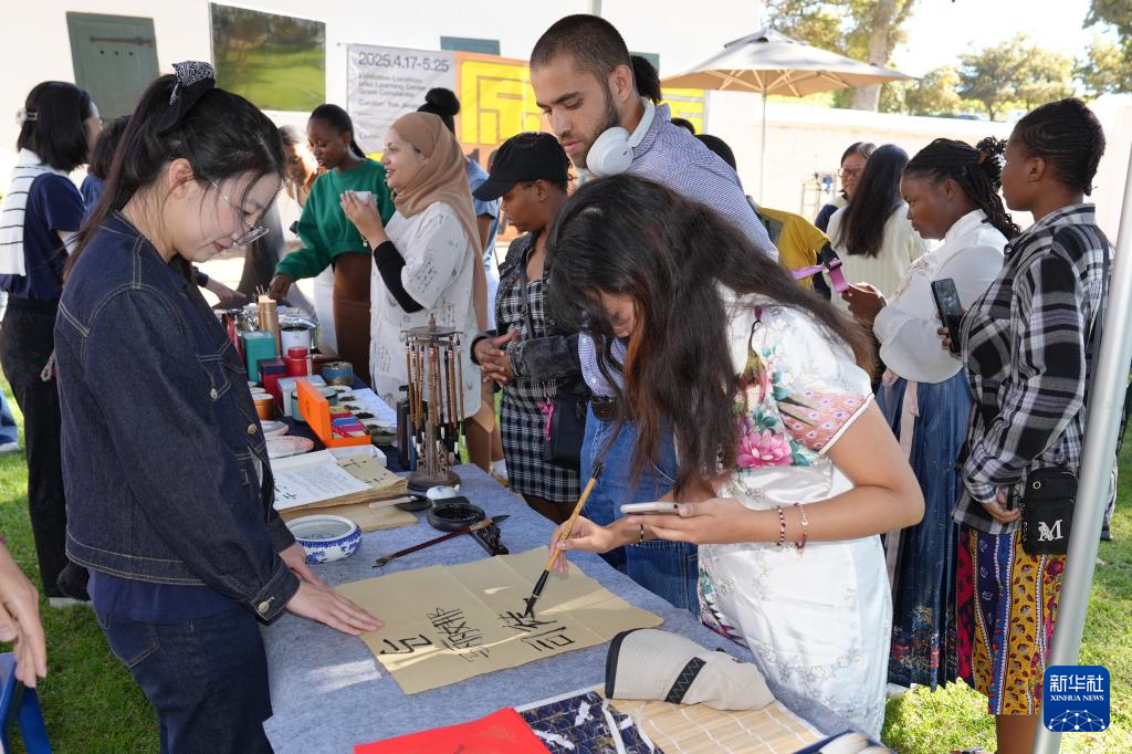 4月17日,在南非开普敦的伊齐科学习中心,人们在“国际中文日”庆祝活动上体验书法和茶艺。