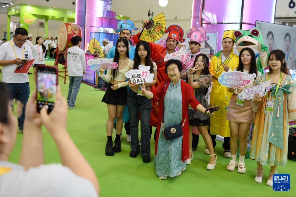 4月18日,观众在第五届消博会展馆与工作人员合影。