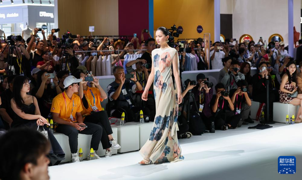 4月17日,观众在第五届消博会时尚生活消费展区观看时装秀。