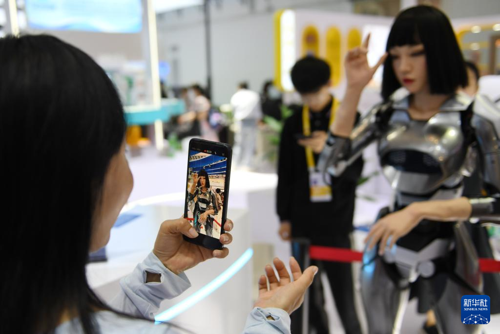 4月18日,观众在第五届消博会辽宁展台拍摄自己与机器人的互动过程。