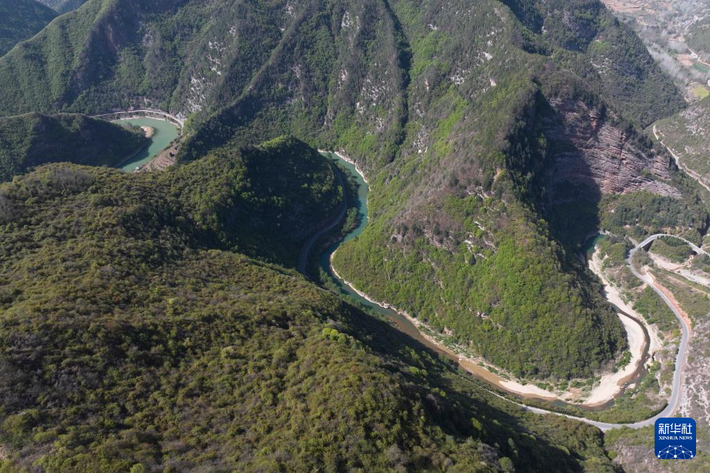 陕西省略阳县乐素河镇的秦岭、嘉陵江景色(4月16日摄,无人机照片)。