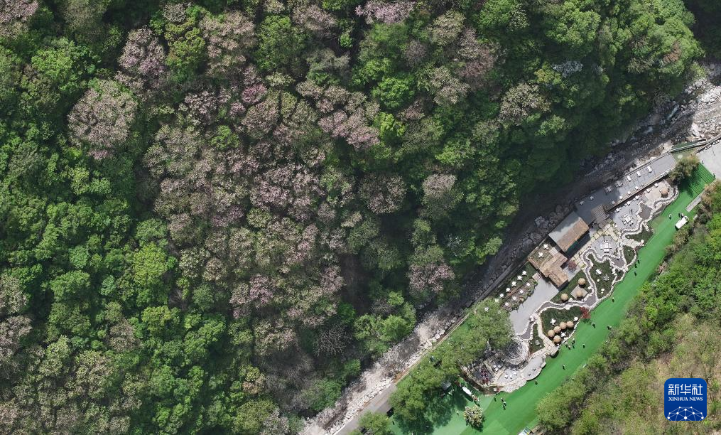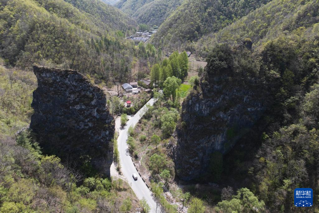 陕西省留坝县玉皇庙镇一处秦岭景色(4月17日摄,无人机照片)。