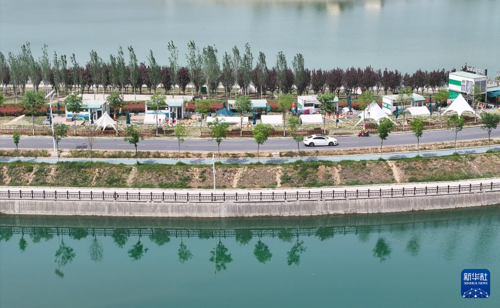 这是坐落在秦岭脚下的西安市鄠邑区天桥湖景区(4月16日摄,无人机照片)。