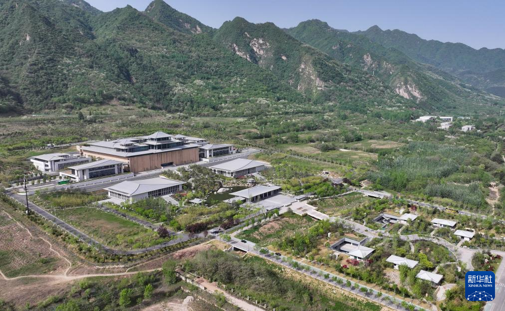位于西安市鄠邑区的国家版本馆西安分馆和周边的秦岭景色(4月16日摄,无人机照片)。