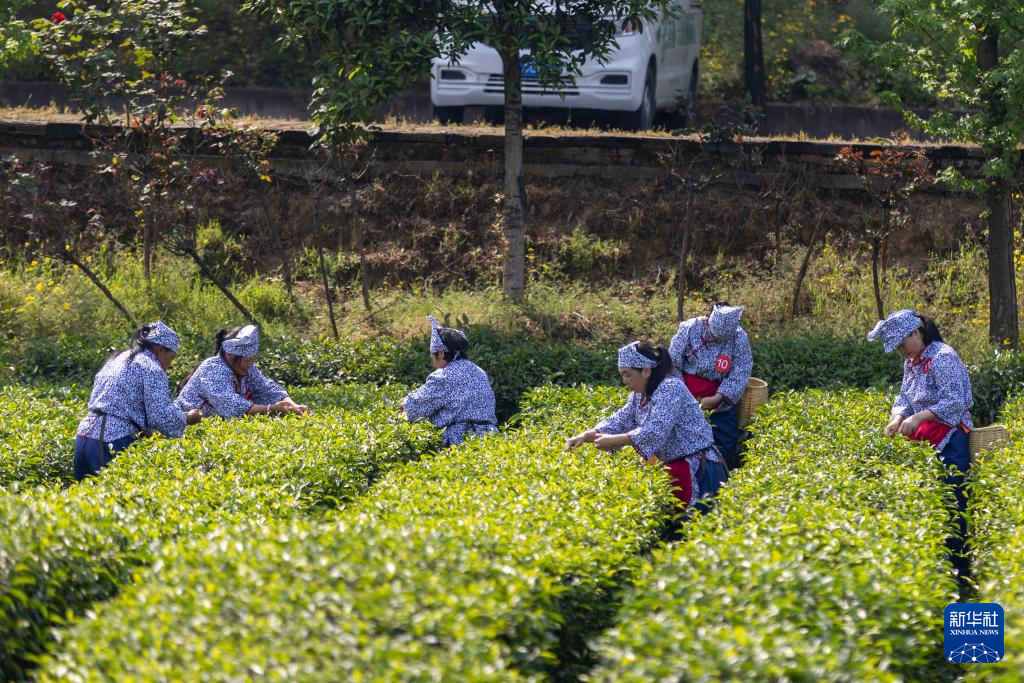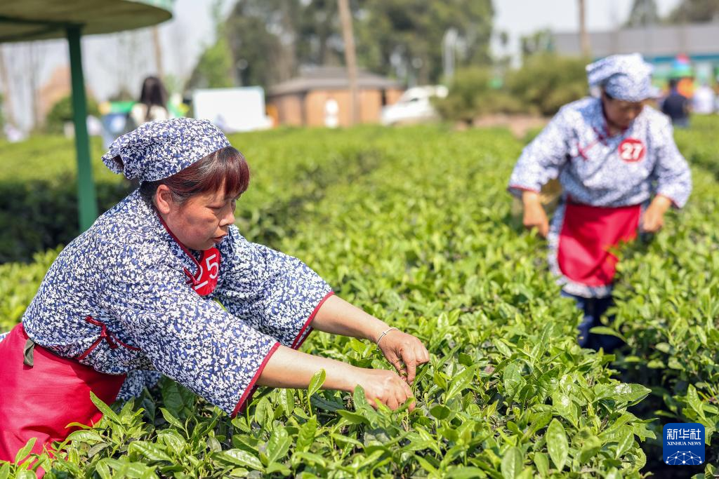 4月18日,选手在重庆市永川区何埂镇石笋山茶园采茶。